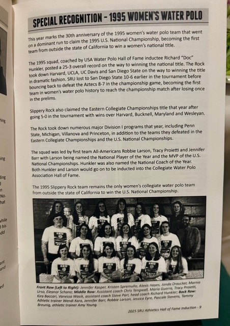 BRIDGEPORT, Pa. — The 1995 Slippery Rock University women’s water polo National Championship team was recognized for the 30th anniversary of its title during the 2025 Rock Athletics Hall of Fame Banquet on Friday, September 12.
