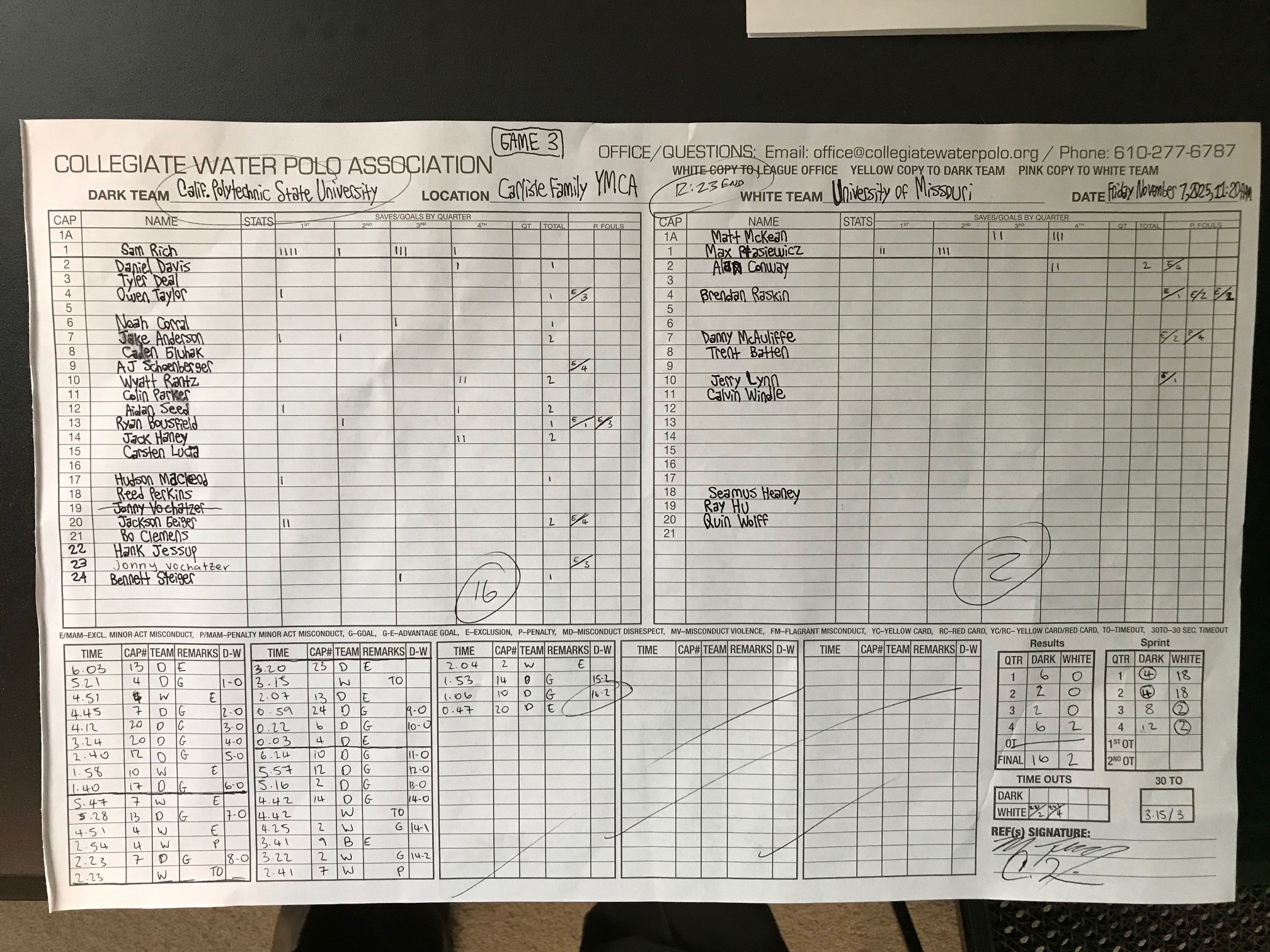 | Saves: | Cal Poly – Sam Rich (9) ; Missouri – Max Ptasiewicz (5, 14 minutes), Matt McKean (5, 14 minutes) | |||||