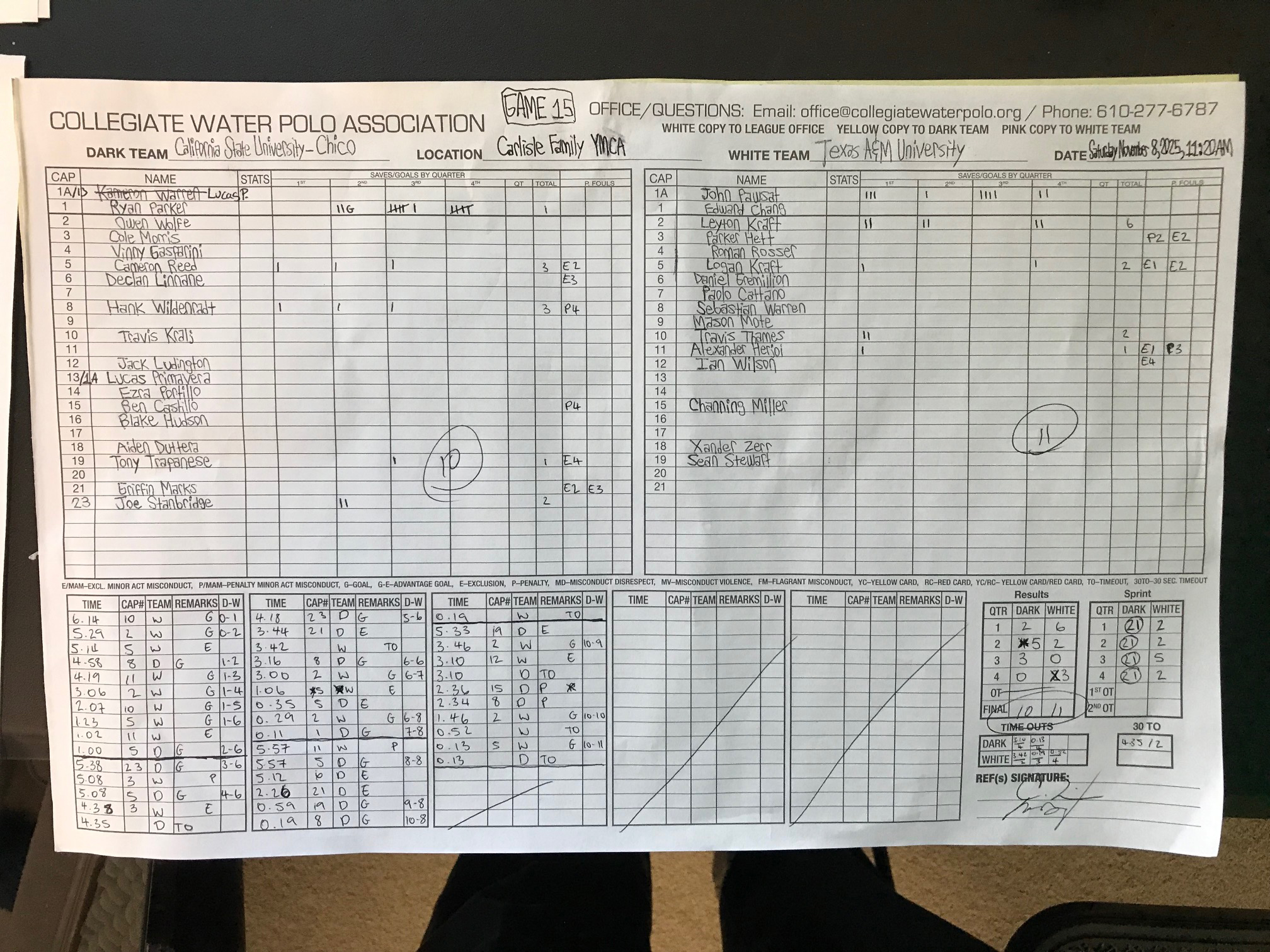 CARLISLE, Pa. — Goalkeeper John Pawsat (So., Houston, Texas) made 10 saves and Leyton Kraft (Sr., Pearland, Texas) contributed a contest high six goals as Texas Division Champion/No. 12-ranked Texas A&M University built an early lead, fell behind in the third quarter and rallied back in the fourth quarter for an 11-10 defeat of Sierra Pacific Division Champion/No. 1 California State University-Chico in the semifinals of the 2025 Men’s National Collegiate Club Championship at the Carlisle YMCA Aquatic Center.
