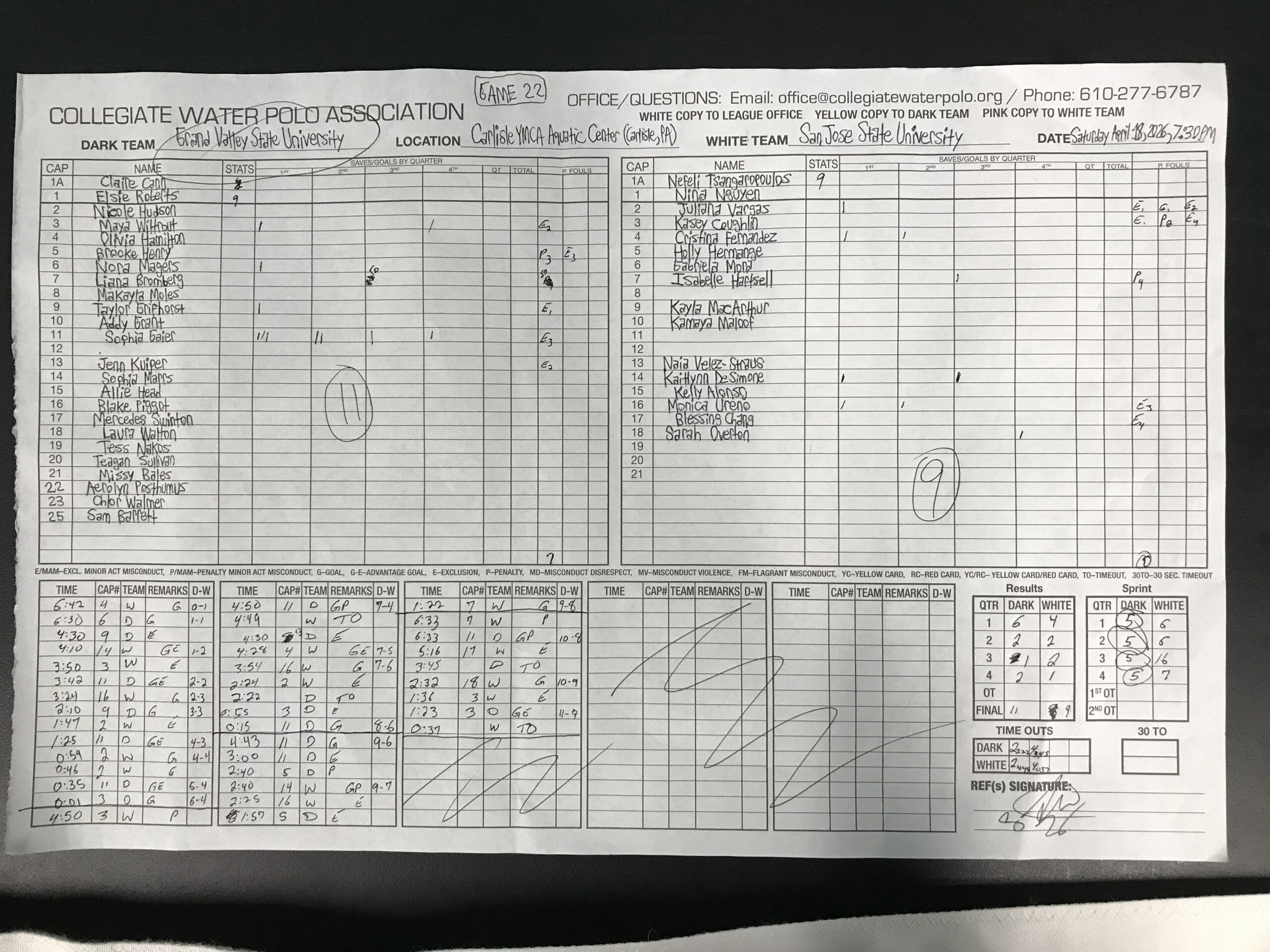 CARLISLE, Pa. — Sophia Gaier (Fr., New Lenox, Ill.) of No. 15-ranked/No. 7 position/Midwest Division Champion Grand Valley State University scored seven times to collect Player of the Game accolades as the Lakers dunked No. 20/No. 11 position/Bay Area Division Champion San Jose State University, 11-9, to earn a spot in the 2026 Women’s National Collegiate Club Championship Fifth Place game.