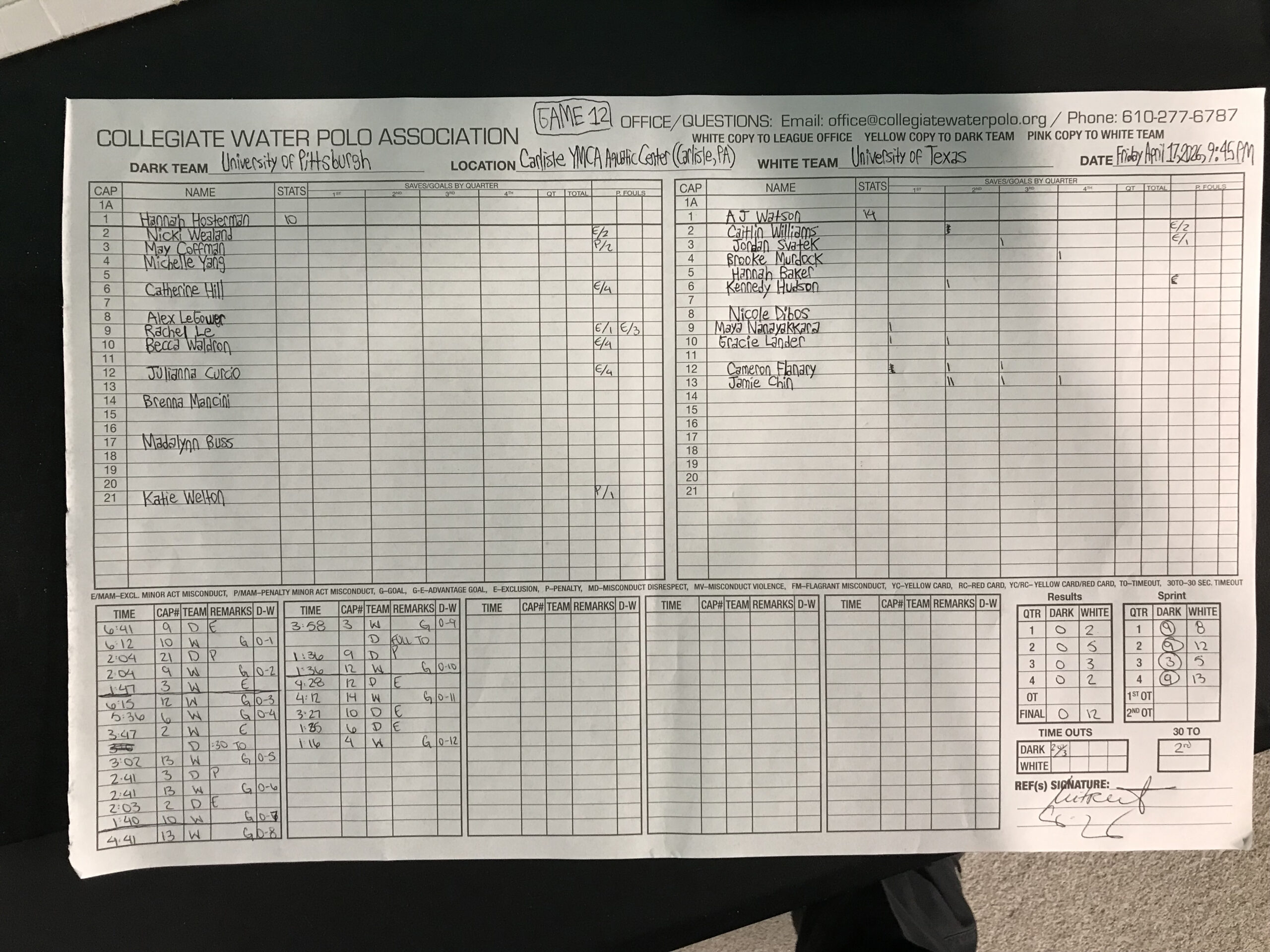 Competing at the Carlisle YMCA Aquatic Center, the Longhorns outscored the Panthers 2-0, 5-0, 3-0 and 2-0 in the first-to-fourth quarters, respectively, as Texas guaranteed itself a game on Sunday, April 19, due to the victory. Texas will takes on No. 4/No. 12 seed/Southeast Division Champion the University of Florida at 1:40 p.m. Eastern on Saturday, April 18, to determine if either the Longhorns or Gators will contest the Ninth or 11th Place games on Sunday, April 19.