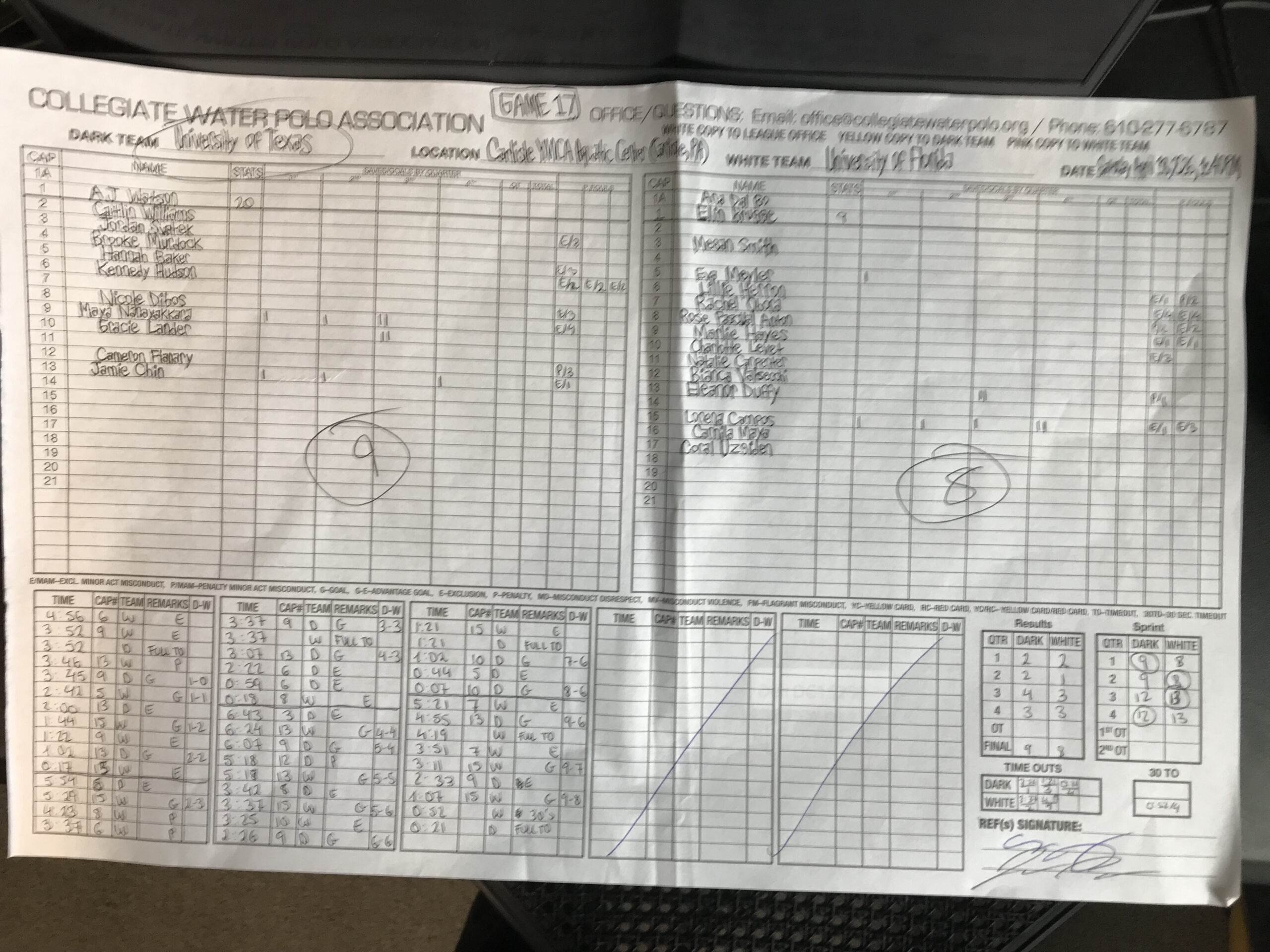 Florida knotted the contest at four-all 36 seconds into the third quarter thanks to a man-up goal from Duffy (6:24), but Nanayakkara put Texas back in front at 5-4 (6:07). Duffy (5:17, penalty shot) and Campos (3:37, man-up) gave the Gators back the lead at 6-5 before Texas turned the tables for good with back-to-back-to-back successful heaves by Nanayakkara (2:26) and Gracie Lander (So., Buda, Texas) (1:02, man-up; seven seconds) to acquire an 8-6 margin with one seven-minute quarter of action left to play.