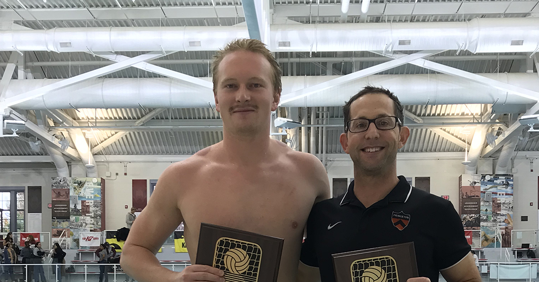 2025 Northeast Water Polo Conference Most Valuable Player Logan McCarroll (#30) & Coach of the Tournament Dustin Litvak of Princeton University